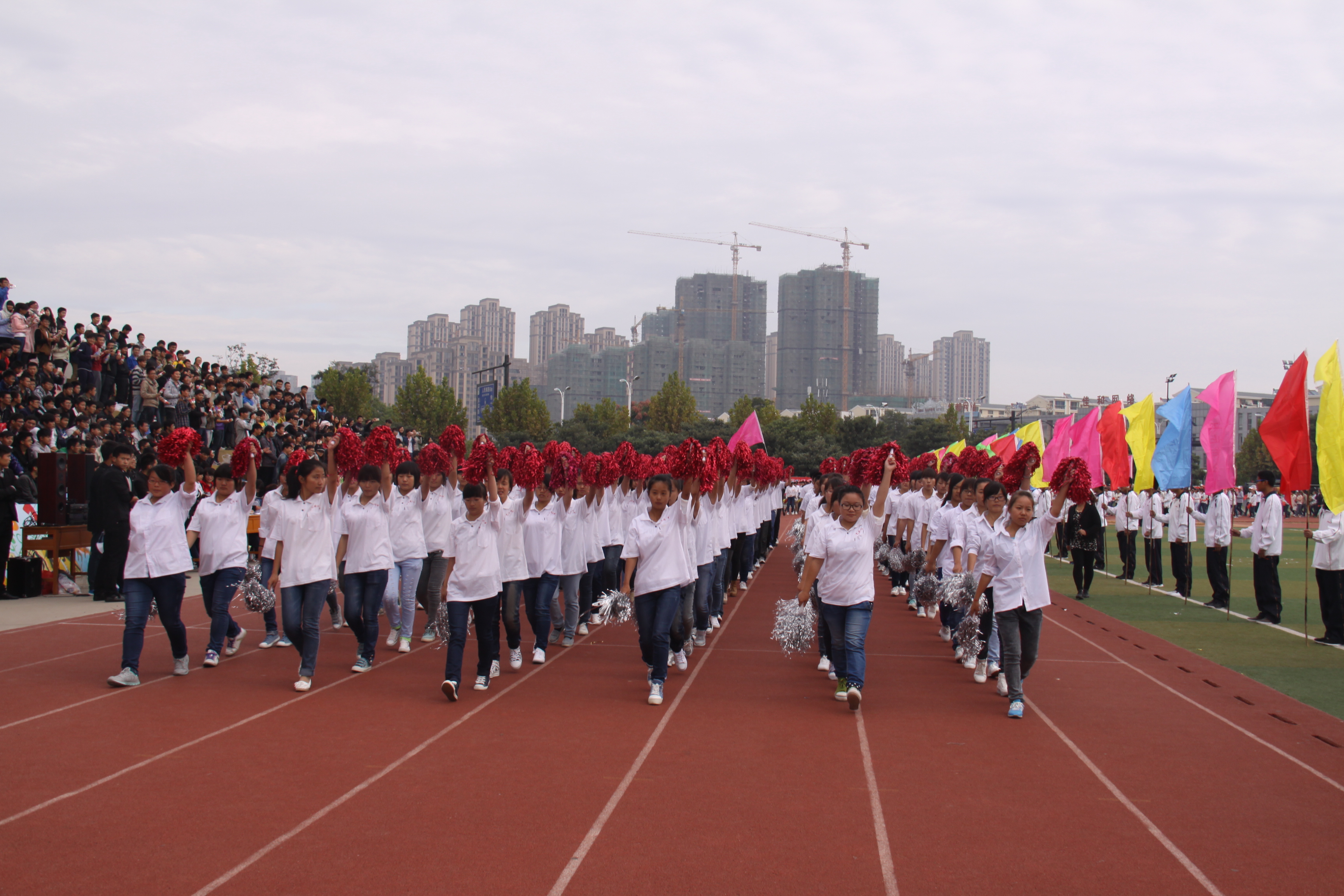裁判员代表体育部施兴成教师、运动员代表纺织工程系工艺1203班阚周亚开幕式上依次上台宣誓。上午9点整,院党委书记张荣华宣布本届运动会开幕。激烈的比赛随即展开。本届运动会有学生代表队5支,教职工代表队8支,共718名运动员参赛。为了做出自己的特色,各系的助威团想出了各种花样,传递欢乐,传递梦想;张扬个性,律动青春。