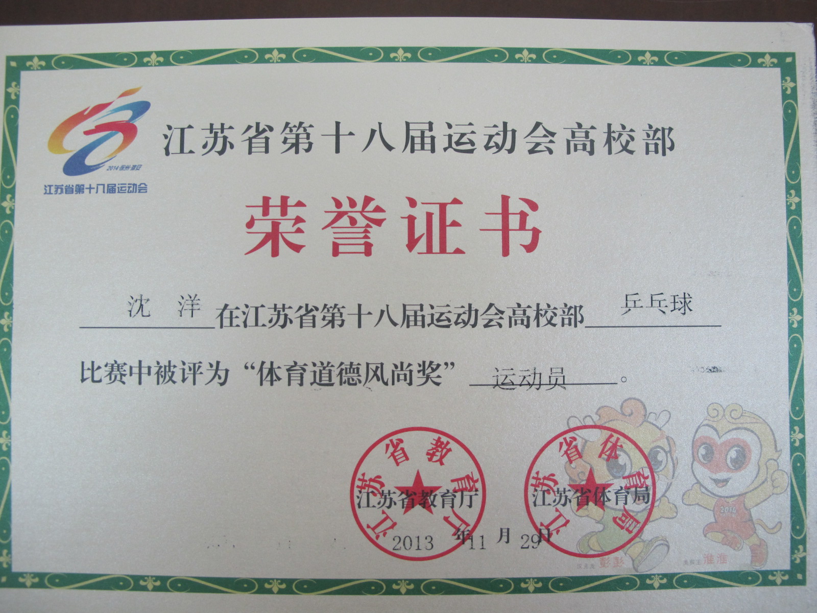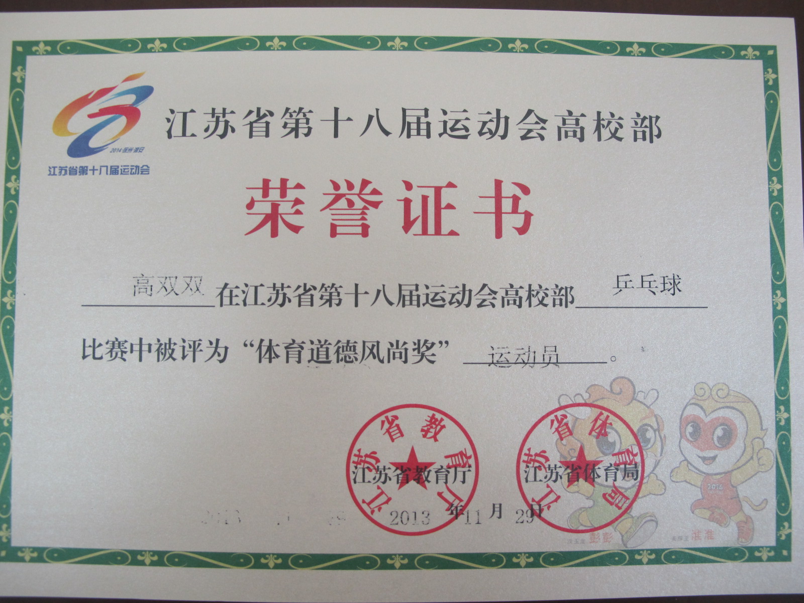 为了贯彻落实《省教育厅、省体育局关于举办江苏省第十八届运动会高校部乒乓球比赛的通知》精神,我院本着学习、交流的目的,组队参加了11月25日至11月29日在南京工业职业技术学院进行的乙组比赛,经过激烈角触,我院男女队均取得了团体小组第三名的好成绩。我院代表团并被评为“体育道德风尚奖”运动队,沈洋、高双双两同学被评为“优秀运动员”。