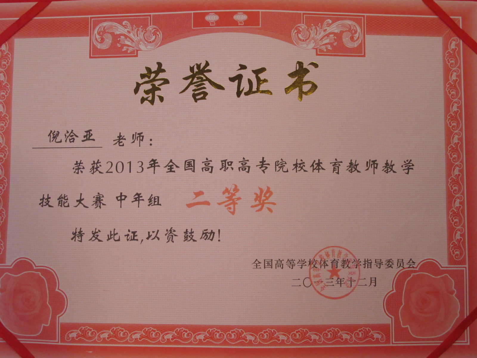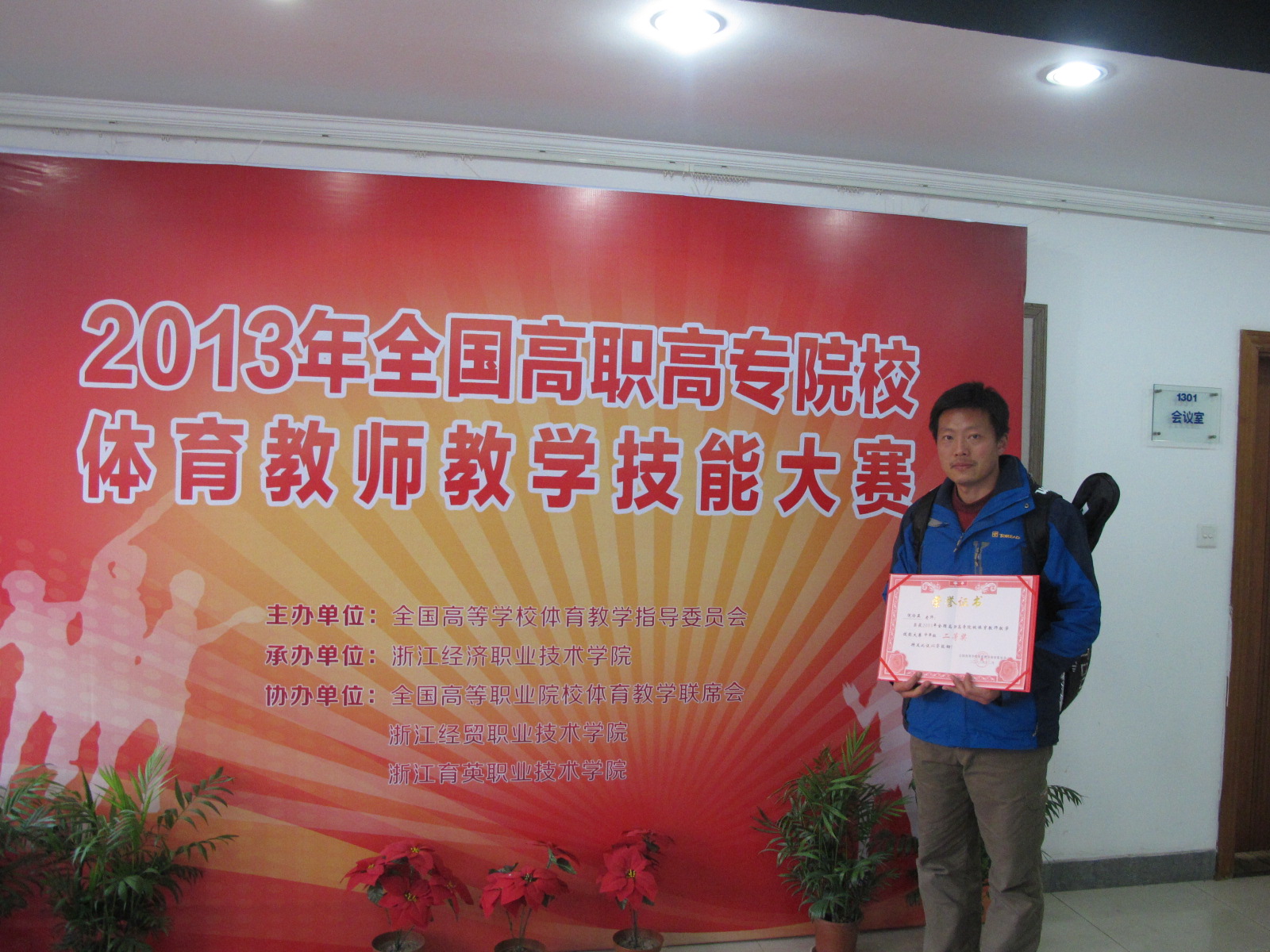 12月18日至22日,来自全国32个省、自治区、直辖市、新疆建设兵团的280名高职高专院校的体育教师,参加了教育部全国高等学校体育教学指导委员会主办,浙江经济职业技术学院承办的“2013年全国高职高专院校体育教师教学技能大赛”。 我院体育部倪洽亚教师作为江苏省代表团的一员,经过教师的体能与急救、运动技术主项、运动技术副项、教案设计、微课程作品等比赛,发扬团结协作、顽强拼搏、敢于争先的精神,赛出了风格,赛出了友谊,赛出了水平,以良好的竞技水平和优良的精神风貌取得了二等奖的优异成绩。