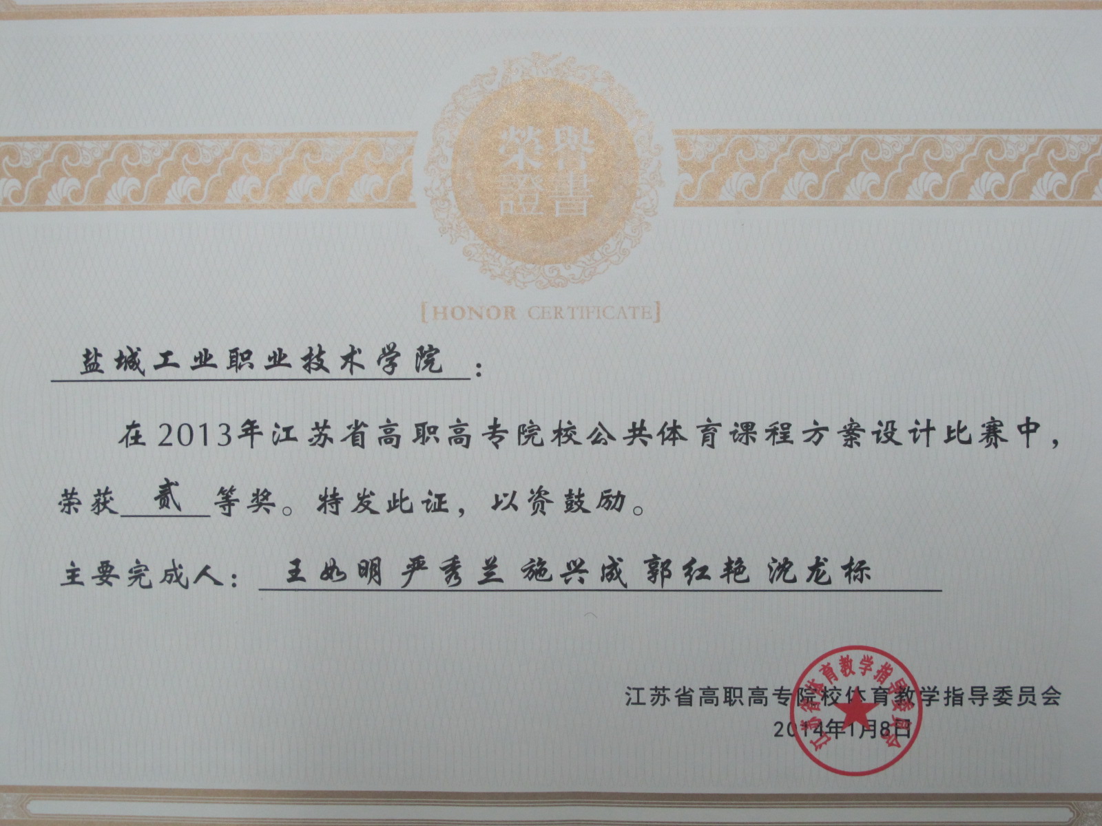 为了认真贯彻《中共中央国务院关于加强青少年体育增强青少年体质的意见》(中办发7号)和《关于进一步加强学校体育工作若干意见的通知》(国办发53号)文件精神,全面落实《全国普通高等学校体育课程教学指导纲要》和《江苏省高职高专院校公共体育课程实施意见》,全面提升全省高职高专院校公共体育课程建设水平,经教育厅同意,由江苏省高职高专院校体育教学指导委员会主办,南京化工职业技术学院承办的“2013年江苏省高职高专院校公共体育课程方案设计比赛”。我院体育部由王如明、严秀兰、施兴成、郭红艳、沈龙标等主要完成人的《盐城工业职业技术学院体育课程方案设计》,在本次比赛中,经过网络评审和会议评审,最终荣获二等奖。