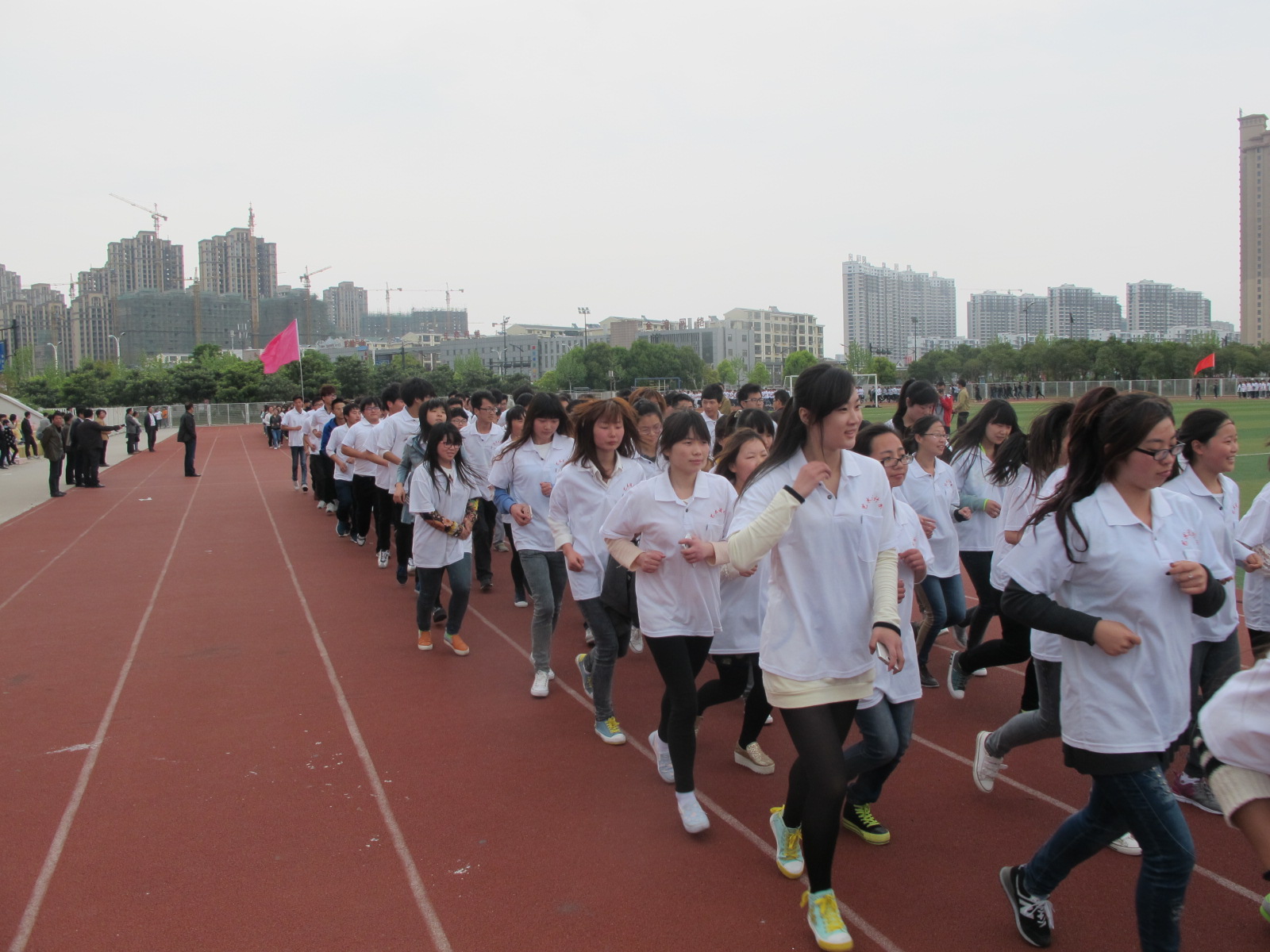4月25日下午,我校第一届阳光体育春季长跑比赛活动在学校运动场举行。学校副院长张林龙、宣传部蔺俊部长、团委副书记陈杰、各院(系)学生主任、辅导员及各院(系)长跑队队员共一千多人参加了此次活动。大会由素质教育中心副主任杨娟主持。