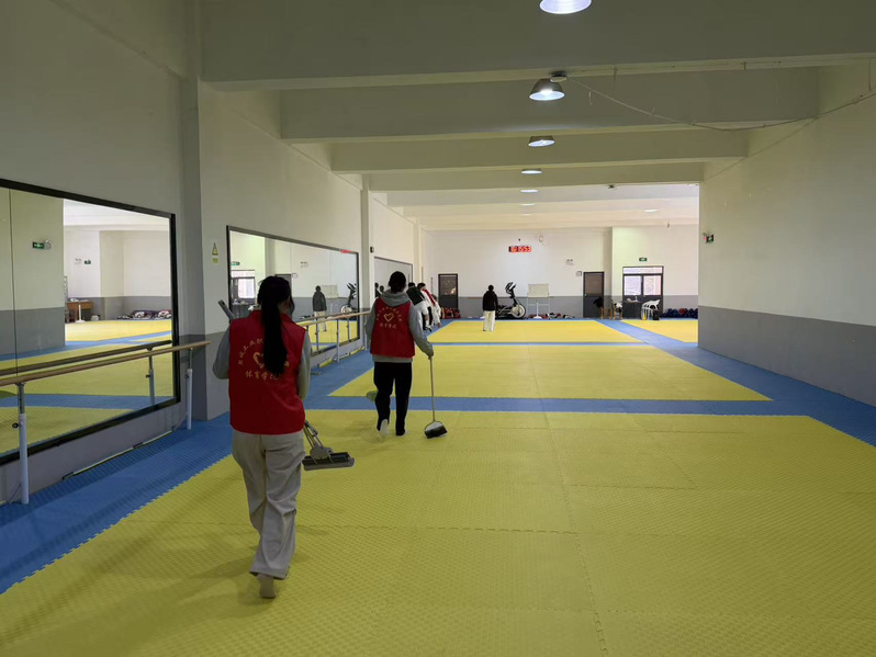 活动现场,志愿者们分工明确、配合默契,手持扫帚、抹布、拖把等清洁工具,对体育中心走廊、楼梯、运动场地、休息区域及周边卫生死角开展“拉网式”全面清理。大家认真擦拭门窗栏杆、清扫地面垃圾、规整杂物堆放处,不放过任何一处细节盲区。尽管清扫工作琐碎繁杂,同学们始终热情高涨、干劲十足,用汗水换来了运动空间的整洁有序,充分展现出新时代青年吃苦耐劳、乐于奉献的良好精神风貌。